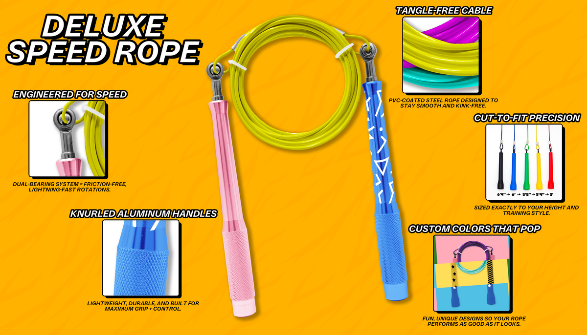 Your rope, your way. Choose from a range of custom handle colors, and design options to create a rope that reflects your personality. The Deluxe Speed Rope delivers performance without compromising style.
